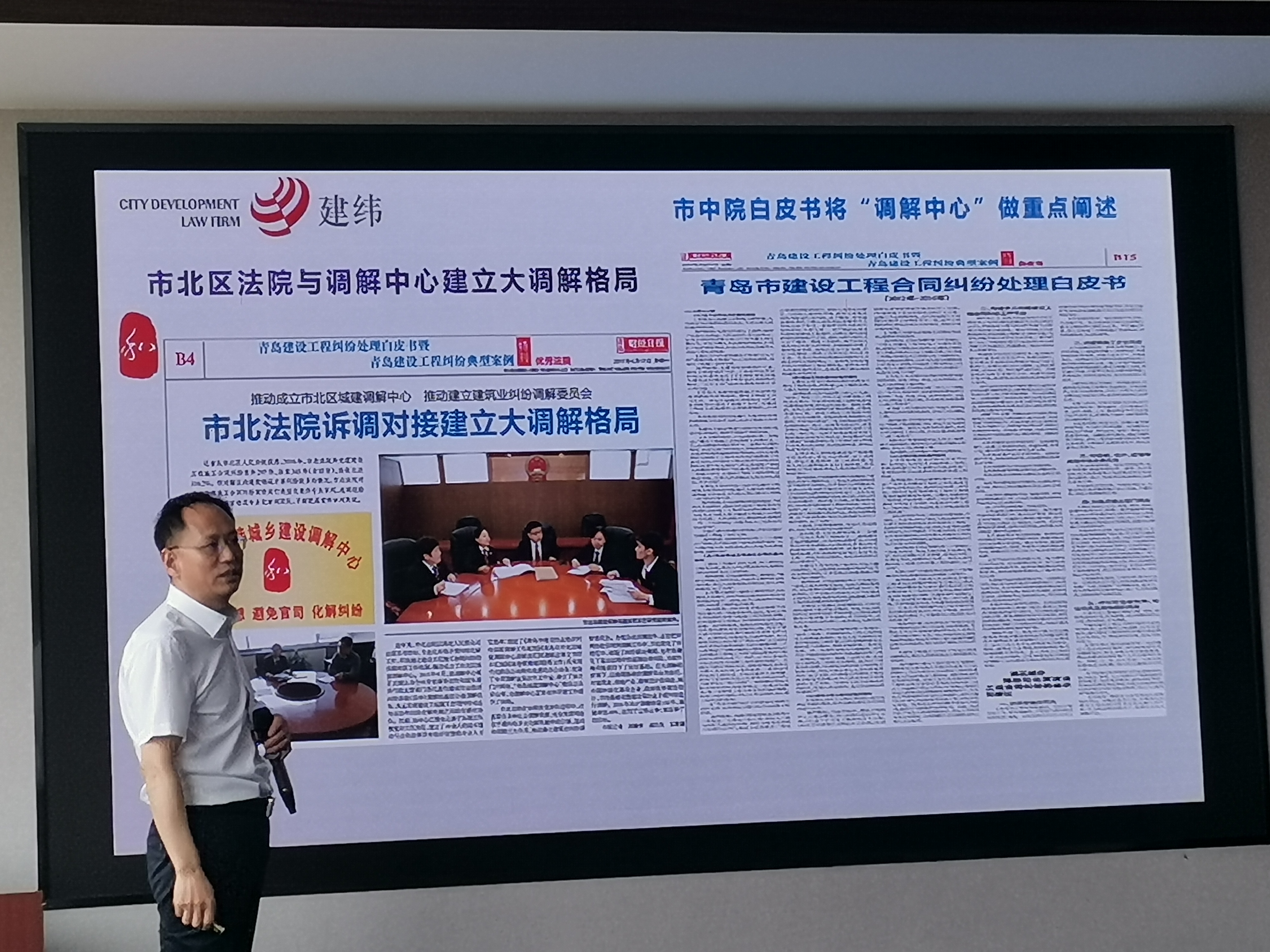 王樹友院長圍繞建筑工程糾紛的特點和解決方案,分享了《構建多元解紛機制,優(yōu)化法治營商環(huán)境》的課件,重點分享了仲裁對建設行業(yè)的特殊優(yōu)勢和這幾年的成功案例,提出了建設企業(yè)掌控法律風險、維護企業(yè)利益和商譽的預控和解決建議方案。薛鵬董事長和苗增剛輪值總裁對仲裁委和建緯調解中心蒞臨集團指導和交流表示歡迎和感謝,介紹了集團經營和發(fā)展情況,共同探討研究了當前集團存在的工程糾紛案例,并表示將進一步加強與青島仲裁委員會建設工程仲裁院和建緯調解中心的交流學習與合作,規(guī)范和化解集團總包和分包合同糾紛風險,更加高效、快捷的解決工程糾紛,維護企業(yè)權益與商譽。