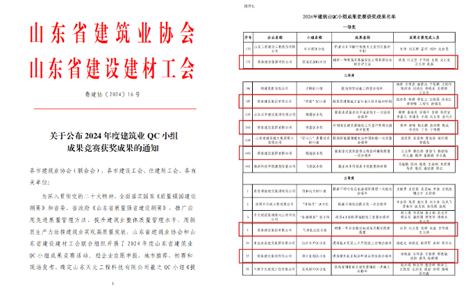 6月26日,由山東省建筑業(yè)協(xié)會開展的“2024年度建筑業(yè)QC小組成果競賽”活動成績公示,榮泰集團(tuán)共獲得6項(xiàng)QC小組成果獎項(xiàng),其中,一等獎1項(xiàng),二等獎3項(xiàng),三等獎2項(xiàng)。并且榮泰集團(tuán)隆海凱旋QC小組——創(chuàng)新一種超高層幕墻安裝工程頂部安全硬防護(hù)方法,成功進(jìn)入中國施工企業(yè)管理協(xié)會決賽。